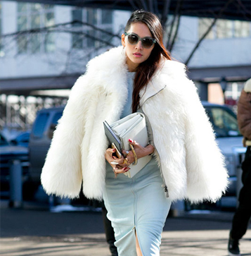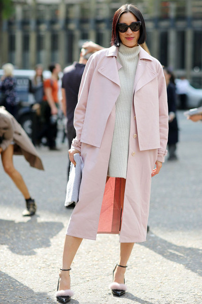Instagram時(shí)尚伙伴關(guān)系負(fù)責(zé)人Eva Chen用簡(jiǎn)約的粉色大衣搭配白色長(zhǎng)款高領(lǐng)針織裙,輕松制造出層次感,絨毛裝飾的尖頭高跟鞋更具玩味。